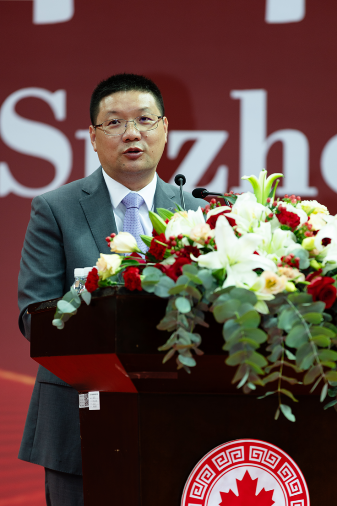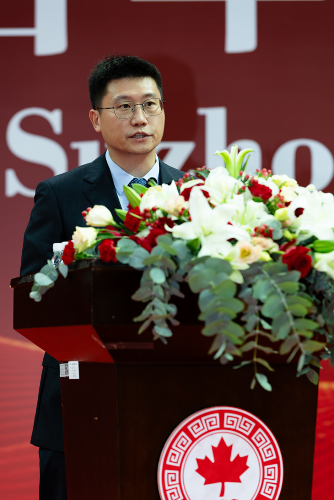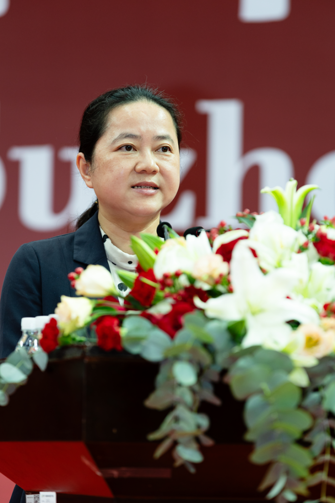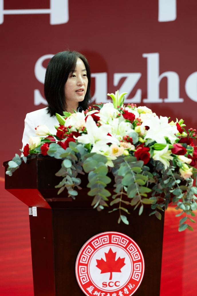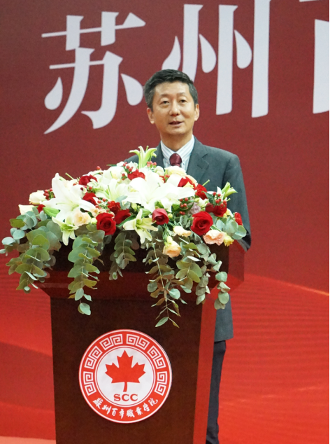 苏州独墅湖科教创新区党工委委员、管委会副主任陈淼首先上台致辞,她代表独墅湖科教创新区管委会向新生们的到来表示热烈的欢迎,她介绍了苏州工业园区在科技创新和产业创新方面取得的成就,以及独墅湖科教创新区作为全国首个高等教育国际化示范区在做好“教育”这篇文章上的努力和成绩。她指出,BB贝博艾弗森官方网站作为经江苏省批准,教育部备案的全国第一所独立法人的中外合作办学高职院校,自成立以来聚力“园-企-校”发展共同体,坚持推进“442”发展战略,面向苏州大市的“1030”产业体系,也同时面向苏州工业园区的“2+4+1”产业方向,深化产教融合,为地方发展输送了一大批的高技能人才。她希望同学们利用好BB贝博艾弗森官方网站的优质教育资源和苏州工业园区的产业化平台,练就真才实学,习得扎实本领,成长为敢为人先,勇攀高峰的高技能型人才。