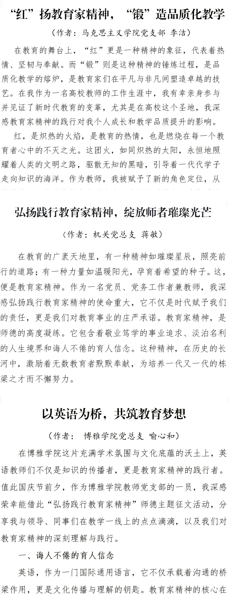 为深入学习和弘扬教育家精神,加强教职人员师德师风建设,提升教师的教育理念和人文素养,贝博官网于近期举办了“弘扬教育家精神”征文活动。此次征文比赛得到了各基层党组织的积极响应,纷纷踊跃投稿。