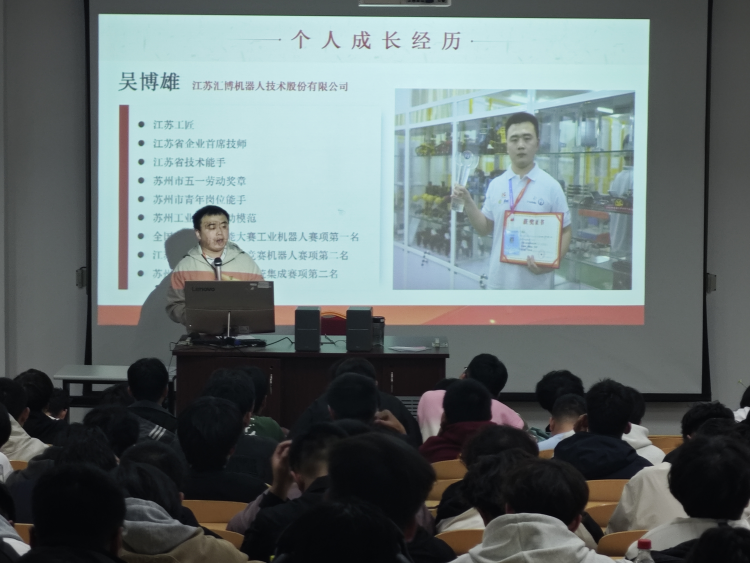 2024年11月12日,江苏汇博机器人技术股份有限公司电气工程师吴博雄应邀来到贝博官网工学院,进行了题为“争做新时代‘匠系青年’——机电一体化技术职业规划”的专题讲座。讲座由工学院党总支书记李永泰主持,旨在帮助学生树立职业理想,明确未来发展方向,培养工匠精神。
