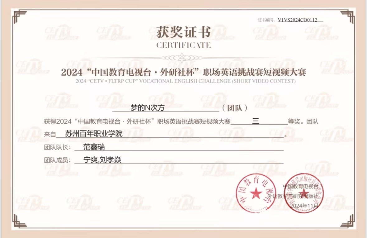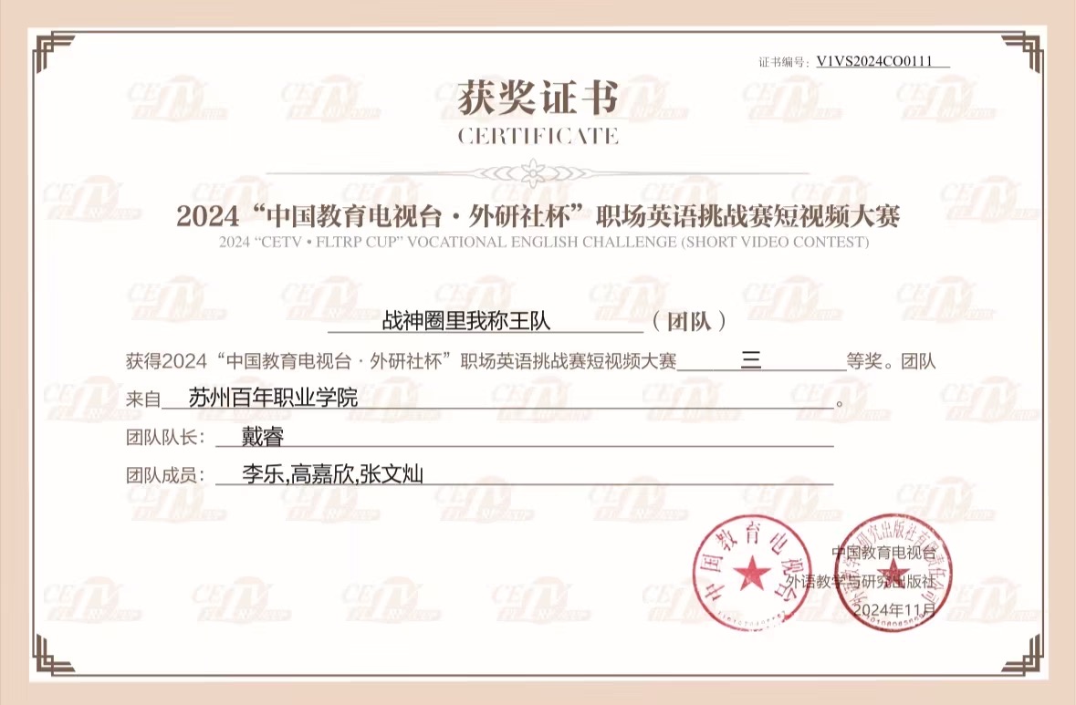 2024年11月15日,由中国教育电视台与外语教学与研究出版社主办的首届“中国教育电视台・外研社杯”职场英语挑战赛英语短视频大赛圆满落幕。经过两个月的激烈角逐,全国131所院校的学生团体在决赛中展开了激烈比拼最终贝博官网两支参赛团队,在李敏老师与朱婧雯老师的指导下,凭借出色的表现分别荣获三等奖。
