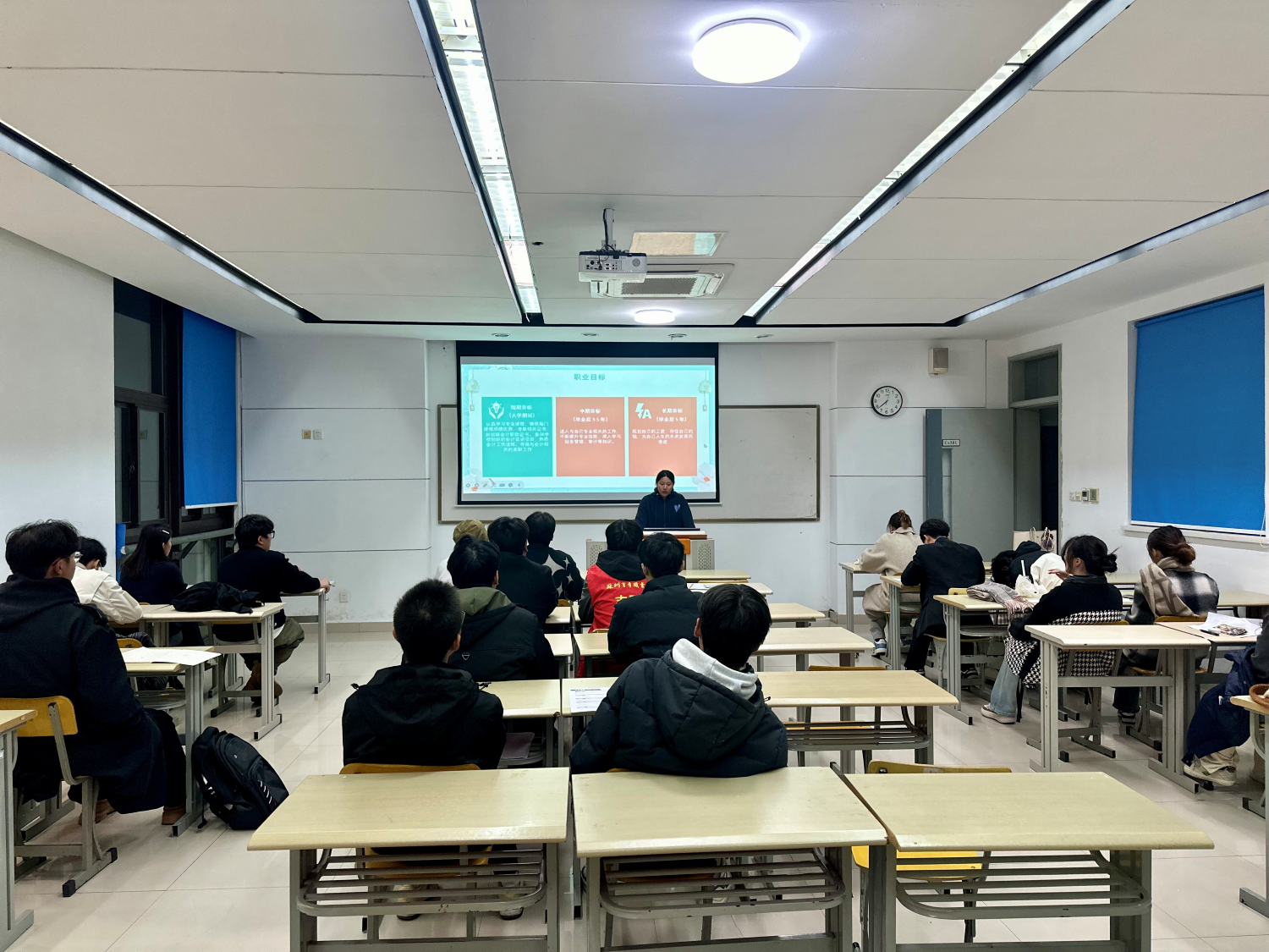 本次比赛分为“展风熠彩”和“职面赛场”两个环节。参赛选手们结合自身专业特点、兴趣爱好、以及所掌握的专业技能,通过精彩的PPT展示和演讲,从自身成长经历、职业分析、实践成果展示、评估与调整等多个方面诠释着自己对未来的憧憬规划与求职意向,让现场评委和观众深切感受到大学生在职业路径选择与未来就业探索上的无限潜力与广阔天地,也了解到大学生职业生涯规划以及个人简历制作的重要性。