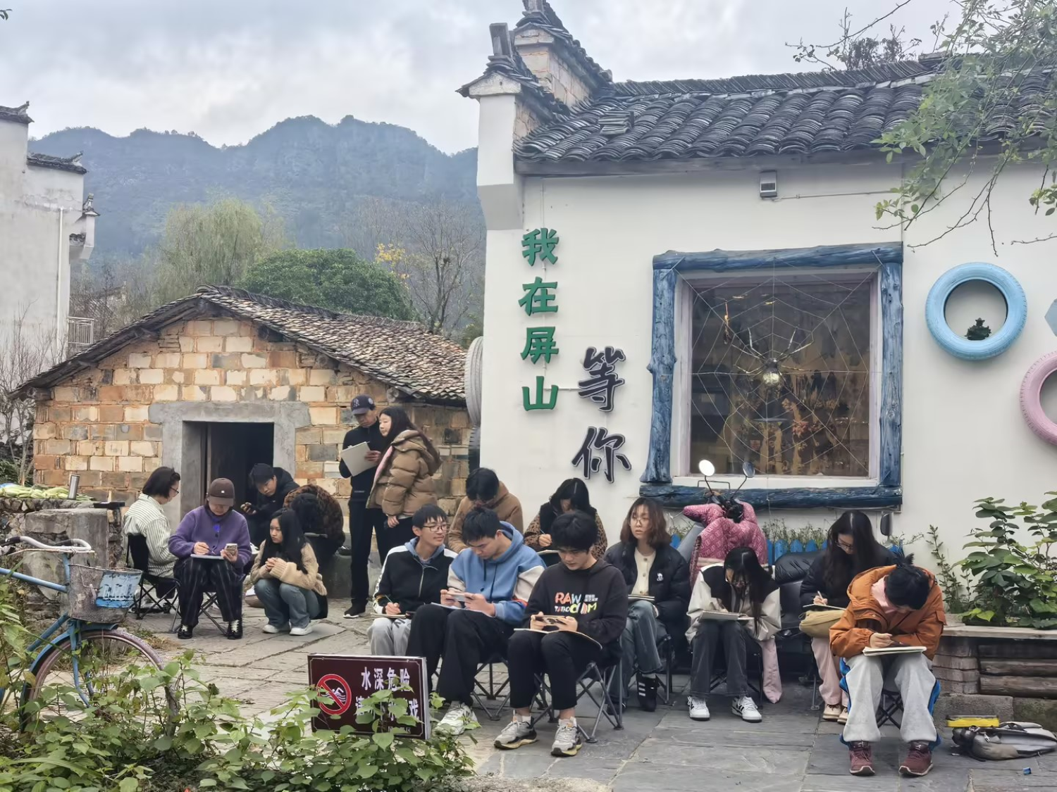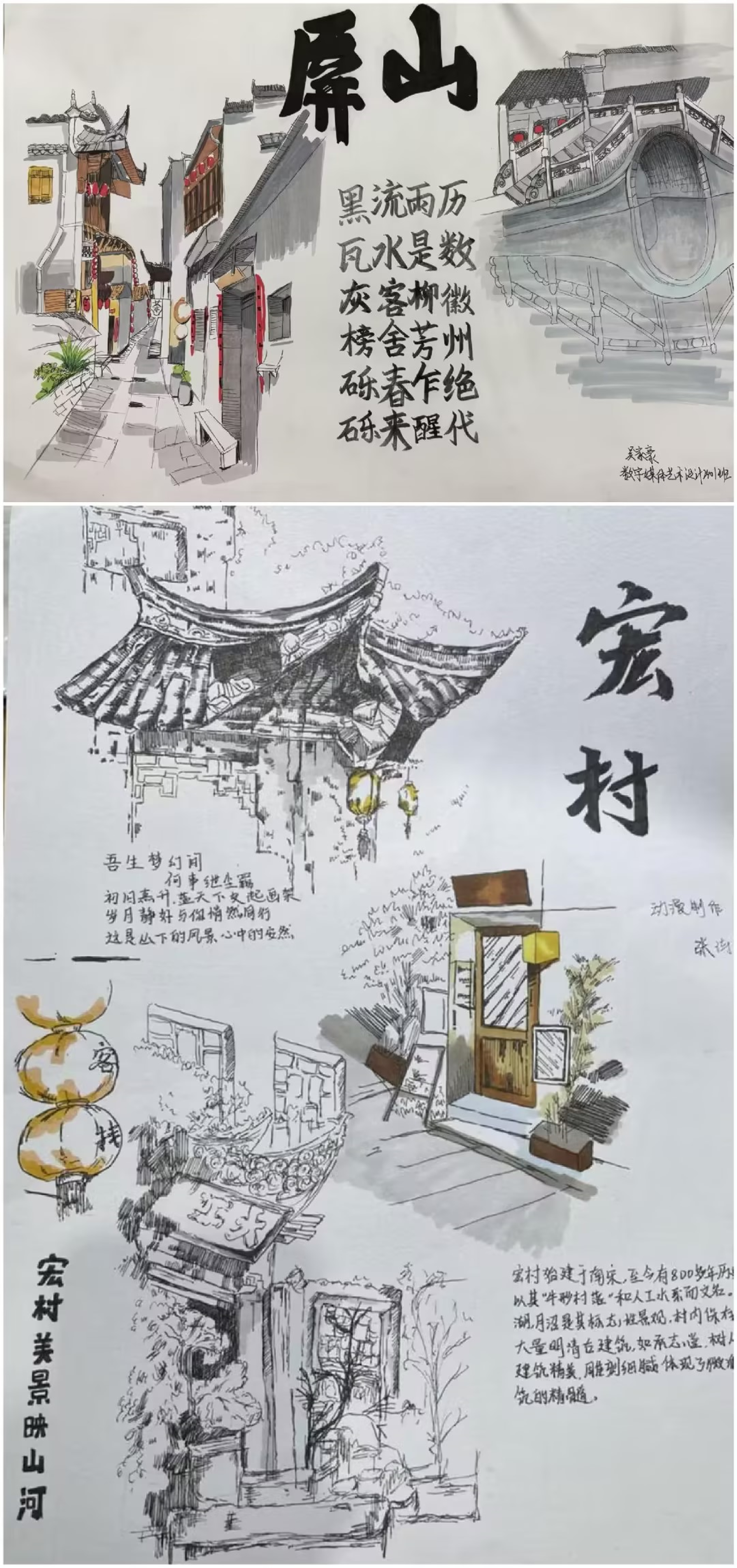 在写生之旅中,学生们前往了宏村和塔川这两个典型的徽派古村落,感受传统村落的独特魅力。宏村古朴的徽派建筑与自然山水相映成趣,塔川的秋色更是为写生创作提供了无尽灵感。在这片富有文化底蕴的土地上,学生们通过亲身体验,深入理解了“天人合一”的艺术理念,画笔下的山水更加生动、富有灵气。