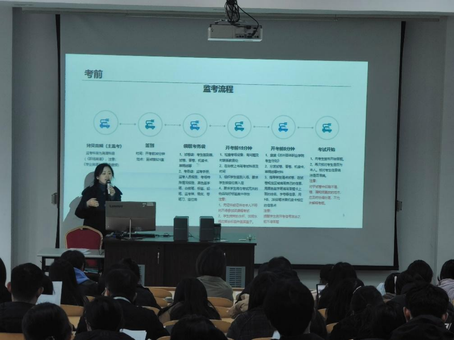 会上,李丹向各位监考人员介绍了期末考试监考工作的基本要求,对监考基本流程、考场纪律管理等多个方面做了详细说明。