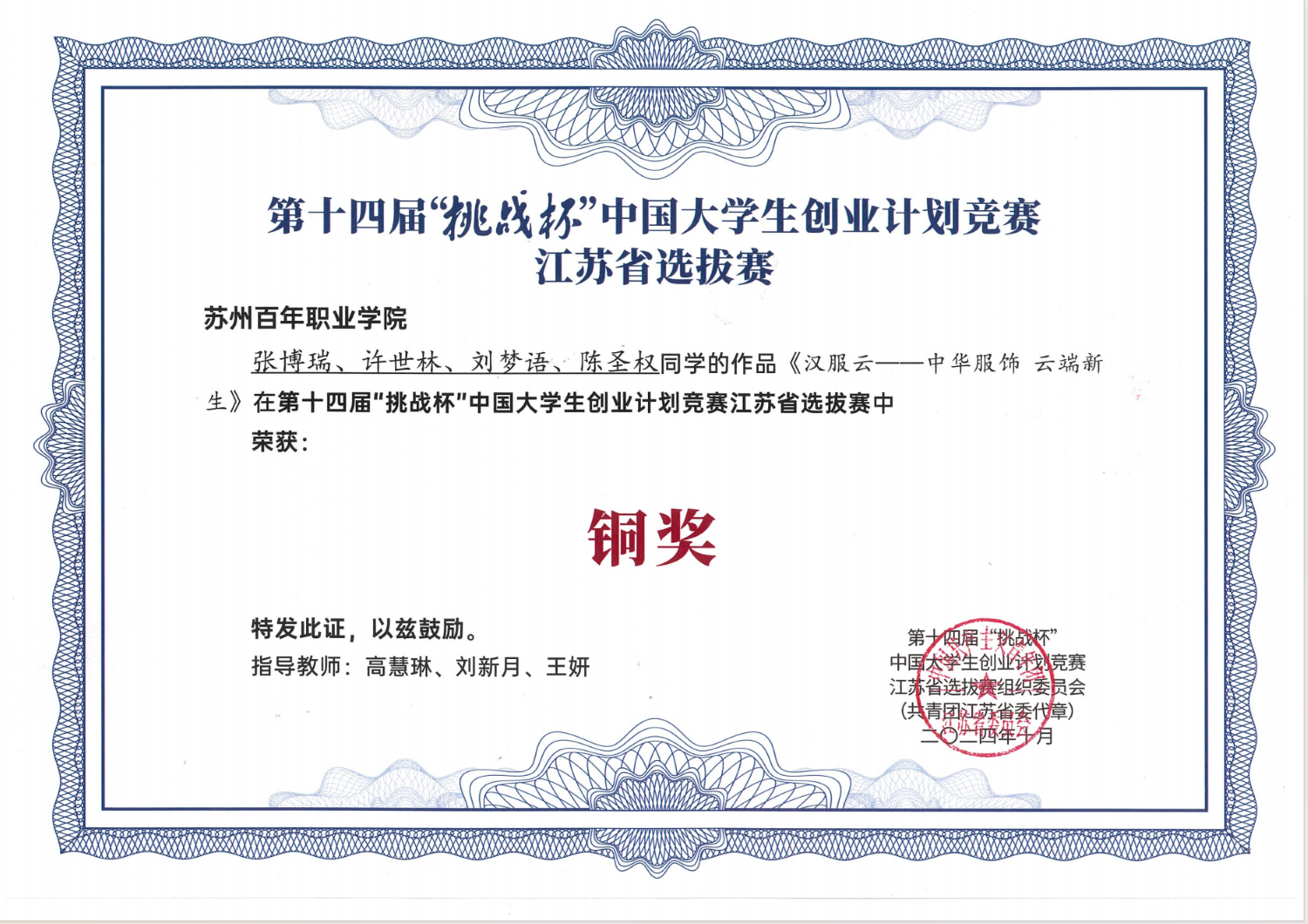 近日,共青团江苏省委、省文明办、省教育厅、省科协、省学联对第十四届“挑战杯”中国大学生创业计划竞赛江苏省选拔赛获奖项目进行了表彰,贝博官网未来工匠学院《心途养老》项目及艺术设计学院《汉服云——中华服饰 云端新生》项目喜获铜奖。