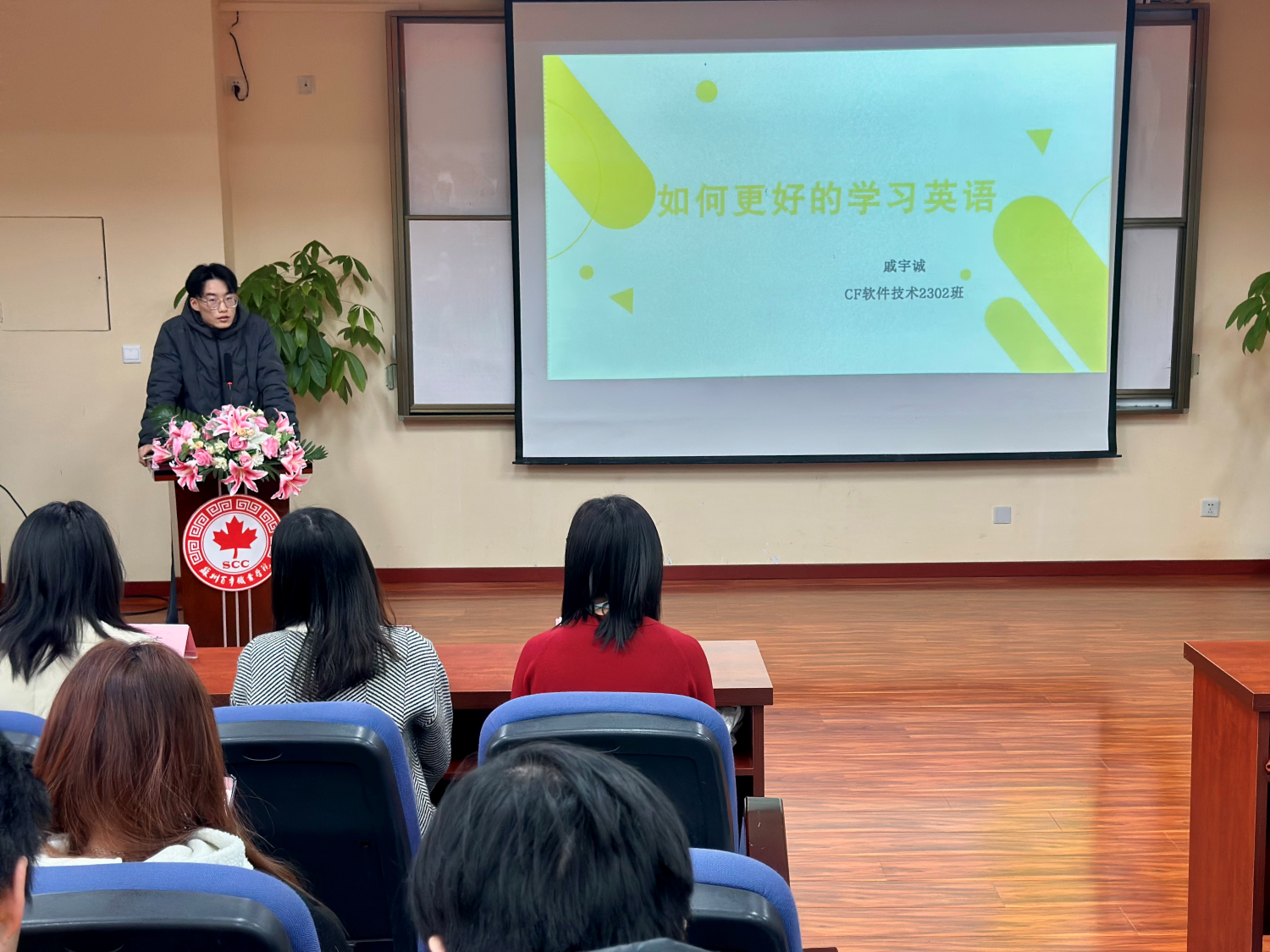23级CF软件技术专业的戚宇诚分享了自己在英语学习上的方法和经验,他用自己英语四级614分和雅思6.5分高分成绩的事实鼓励同学们学习贵在坚持,勇于挑战,其真挚的话语和英语学习经历赢得了在场师生的共鸣。