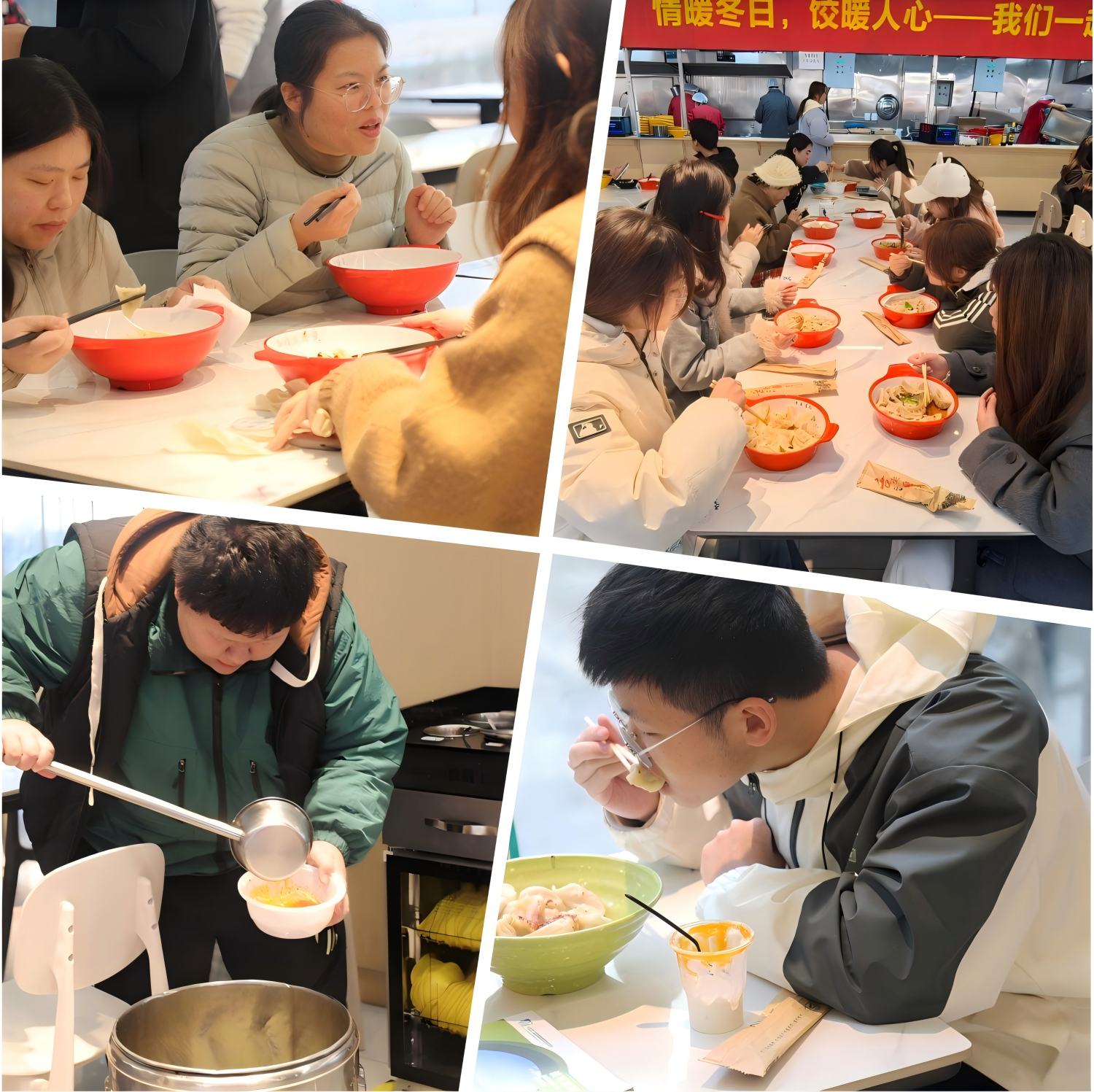 食堂里人声鼎沸、十分热闹,师生们纷纷排队领取到了热气腾腾的饺子。食堂工作人员忙碌而有序地为每一位学生分发着,大家手捧食堂精心准备的饺子,脸上洋溢着满足与幸福的笑容,纷纷表示这是他们在这个冬天收到的最温馨的礼物。
