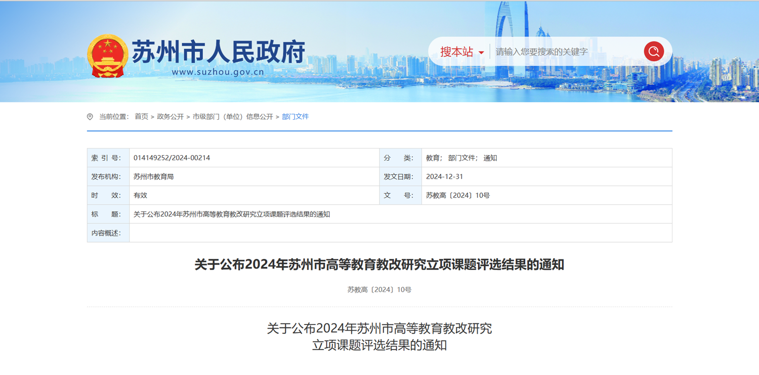 根据《关于开展2024年苏州市高等教育教改研究课题立项建设申报工作的通知》(苏教高〔2024〕7号)精神,经学校申报、专家评审、结果公示,共评选2024年苏州市高等教育教改研究立项课题25项,现予以公布。其中贝博官网李世明、鲁伟作为主持人联袂领衔申报的课题《大学生创新创业教育、创业能力培养的研究》获得正式立项,项目编号为2024SZGJ24。预祝课题组取得丰硕研究成果,按期结项。
