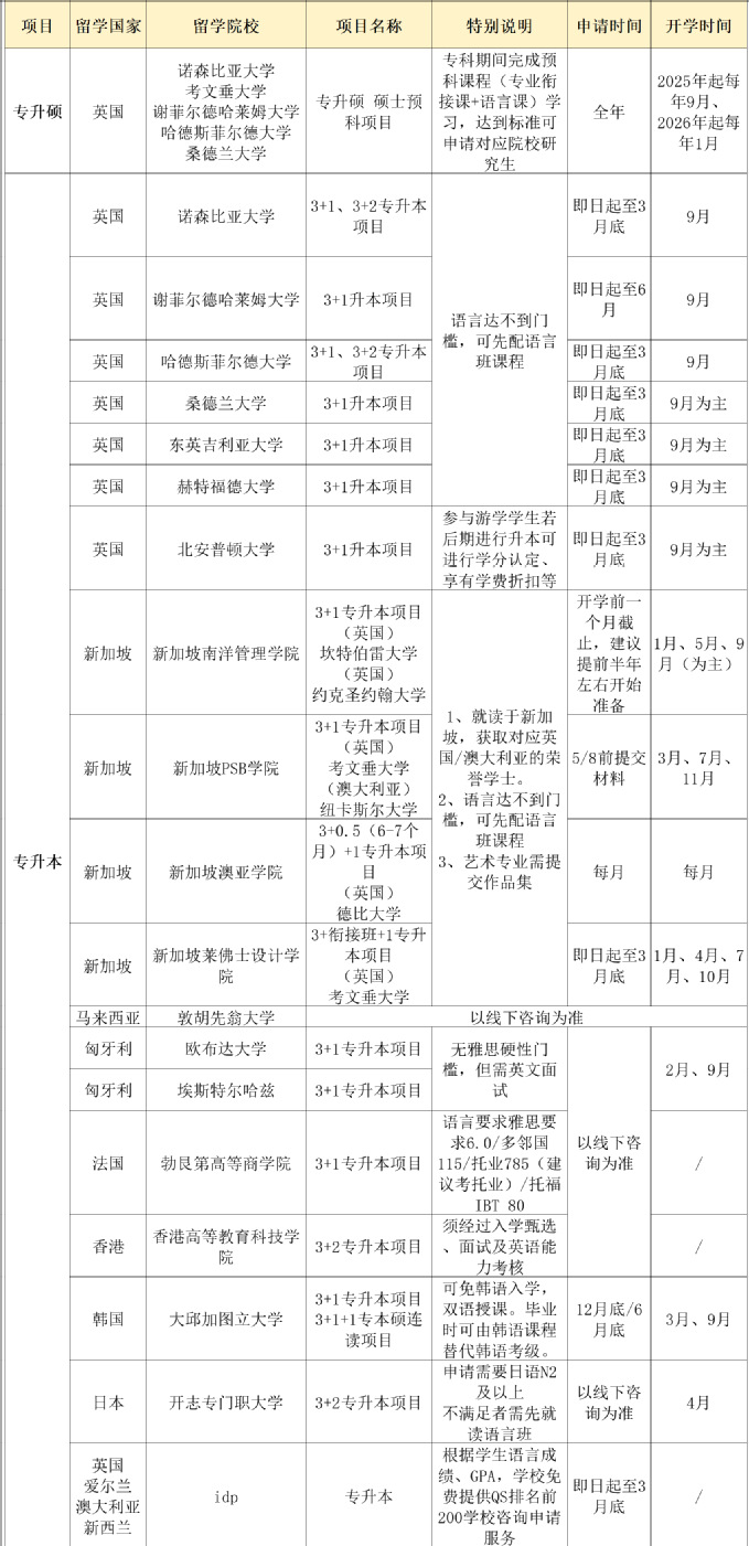 项目 | 留学国家 | 留学院校 | 项目名称 | 特别说明 | 申请时间 | 开学时间 |