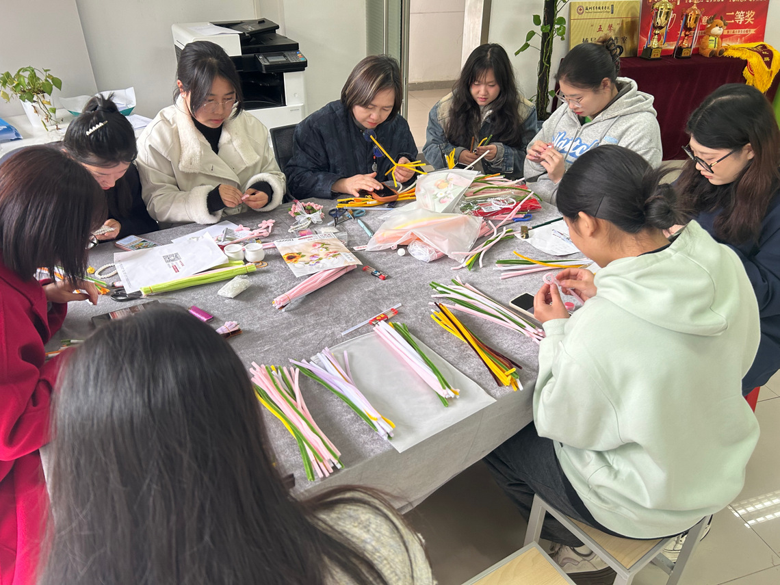 活动现场洋溢着温馨的气息,琳琅满目的彩色扭扭棒、种类繁多的辅助工具整齐排列,仿佛在静静等待着一场创意的绽放。从扭扭棒的初次弯折塑形,到如何运用巧劲编织出层次丰富的花瓣,再到将各个部分巧妙组合成形态各异的花朵,辅导员张菁老师现场教学,每一个步骤张菁老师都演示得细致入微,所有同学和老师都目不转睛,眼神中满是对即将开启的创意之旅的热切期待与好奇。
