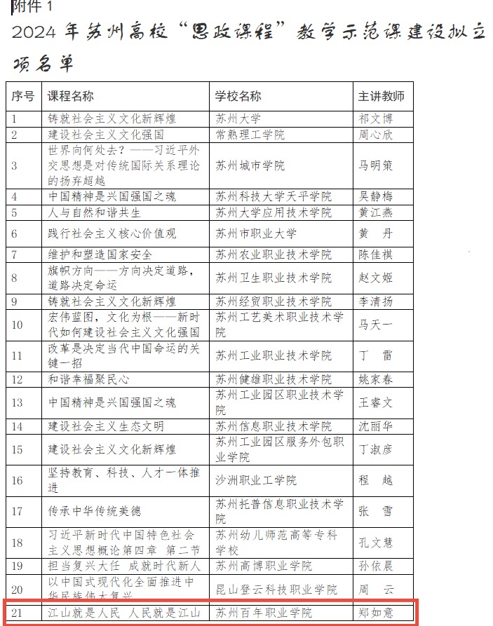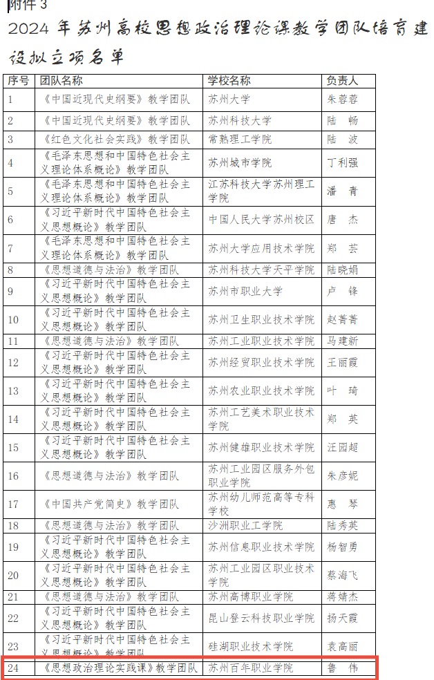 近期,苏州市教育局公布了《关于公布2024年苏州高校“思政课程”和“课程思政”教学示范课、思想政治理论课教学团队培育建设项目名单的通知》(苏教高〔2025〕1号)文件,贝博官网《思政理论实践课教学团队》入选苏州高校思想政治理论教学团队培育建设项目名单,《江山就是人民 人民就是江山》章节教学设计入选苏州高校“思政课程”教学示范课,标志着贝博官网在思想政治理论实践课建设方面阶段性成果。