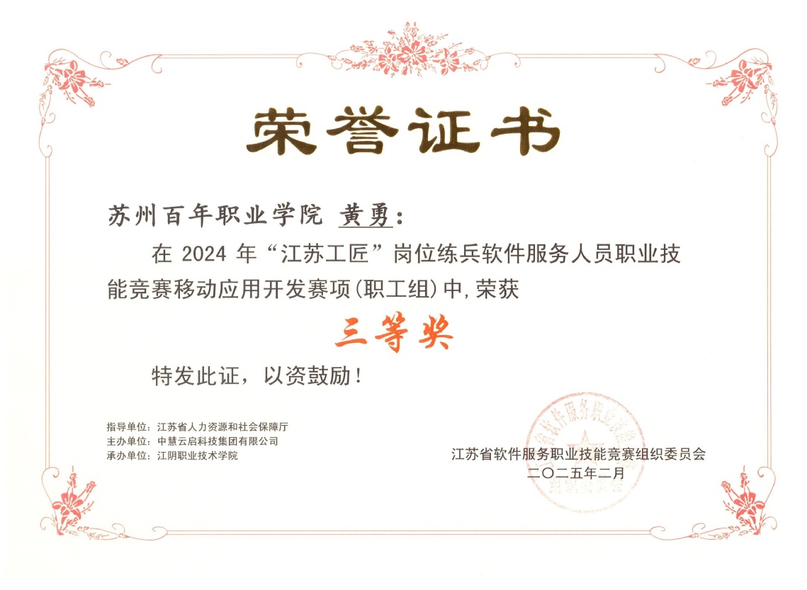 近日,从 2024 年 “江苏工匠” 岗位练兵软件服务人员职业技能竞赛传来喜讯,贝博官网工学院教师黄勇在移动应用开发赛项(职工组)中表现优异,荣获三等奖。这一成绩不仅彰显了黄勇老师的个人专业实力,也为学校及工学院增添了光彩。