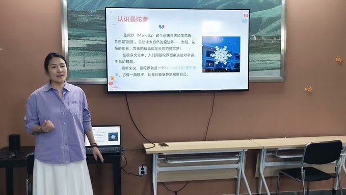 首场活动是《Color Your Soul!曼陀罗心理彩绘派对》。曼陀罗绘画作为一种心理疗愈工具,通过对称的图案结构与自由填色,帮助参与者专注当下、梳理情绪。大学生心理健康教育中心李萌通过引导学生在空白曼陀罗画纸上自由挥洒色彩,或细腻勾勒,或大胆泼墨,将内心的情感转化为斑斓的视觉语言。