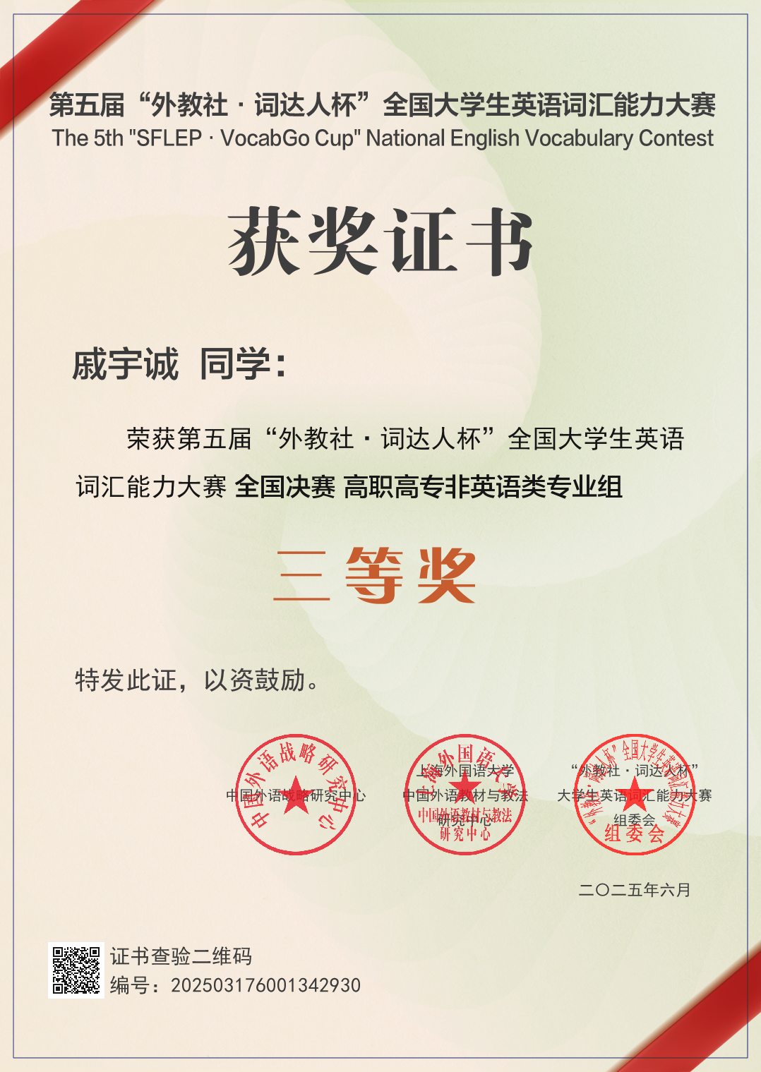 近期,2025年第五届“外教社·词达人杯”全国大学生英语词汇能力大赛省赛与国赛圆满收官。贝博官网二十余名精英学子奋勇拼搏。经过一番激烈角逐,共有12名同学获得省赛奖项,其中戚宇诚和孙崇正两位顺利晋级国赛并获国赛三等奖。