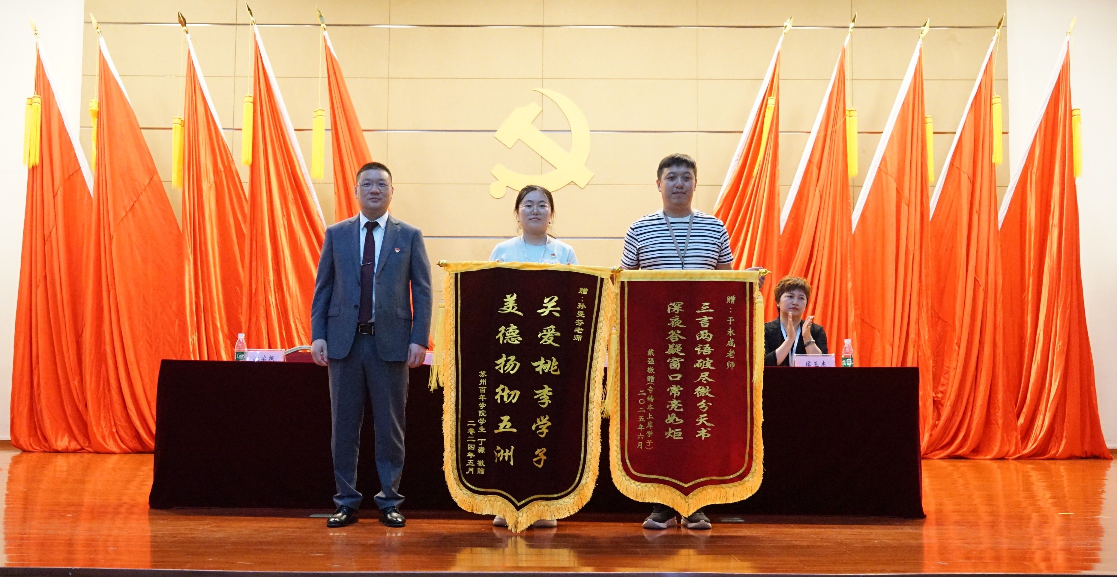 受学生及学生家长委托,校长李世明向于永成、孙旻芬老师赠送了锦旗,感谢他们为学生的成长成才所付出的辛勤努力,表彰他们高度的责任感和崇高的敬业精神。