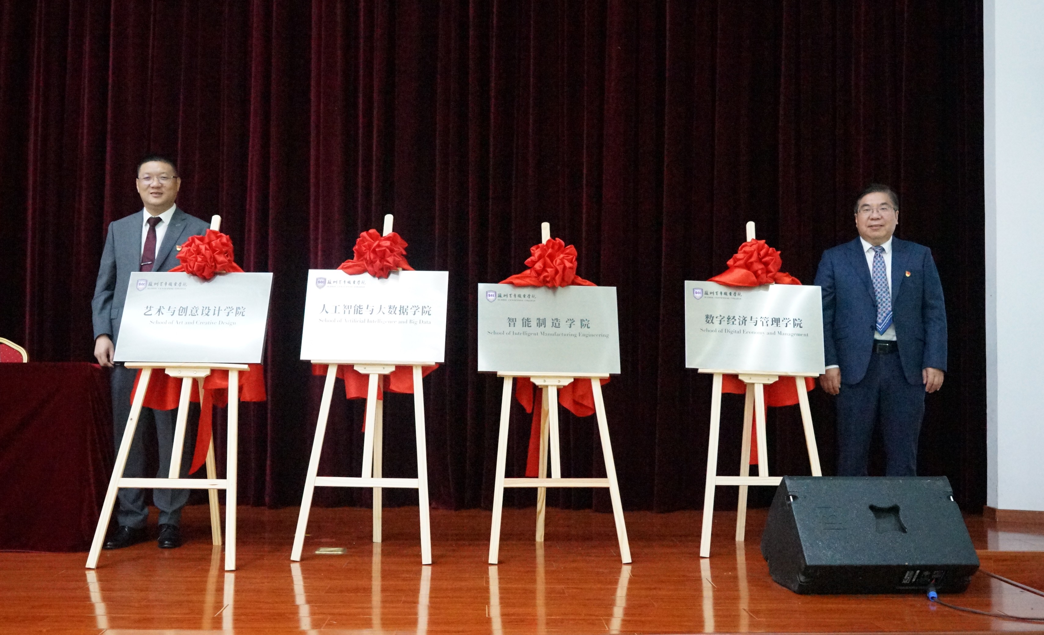 校长助理侯玉杰宣读了《关于成立智能制造学院等四个二级学院的决定》。学校在原有二级学院的基础上,新组建成立了智能制造学院、人工智能与大数据学院、数字经济与管理学院以及艺术与创意设计学院。