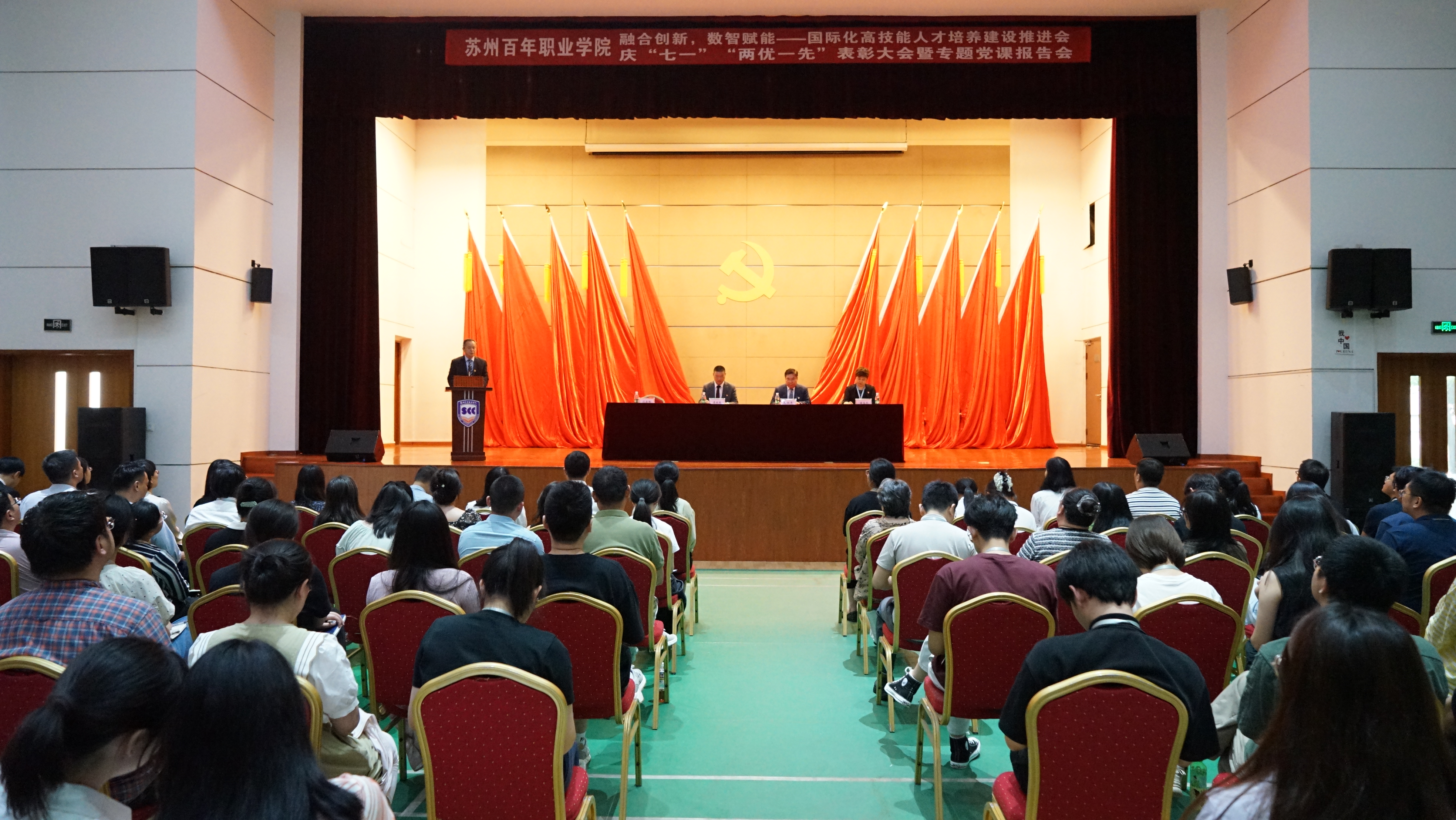 6月27日,贝博官网在润德堂隆重举行“融合创新 数智赋能——国际化高技能人才培养建设推进会”与“庆‘七一’‘两优一先’表彰大会暨专题党课报告会”,在校校领导及全体党员、干部和部分教师代表出席会议。大会由副校长沈宗根主持。