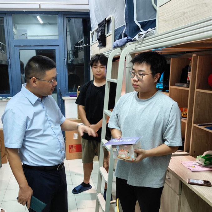迎新当晚,贝博官网校长李世明带领学院领导班子在辅导员老师的陪同下,走进新生宿舍看望同学们。李世明与学生们亲切交流,询问学生是否适应、当天报到路程、是否父母陪同等,详细了解新生的生活需求,鼓励同学们尽快融入大学生活,珍惜在校时光,勇于追求梦想。值得一提的是,当晚恰逢学院一位同学过生日,李世明和老师们共同为学生送上了真挚的祝福,还准备了暖心生日卡和小蛋糕,温暖的话语和细致的关怀让新生们倍感欣慰,现场氛围温馨而感人。