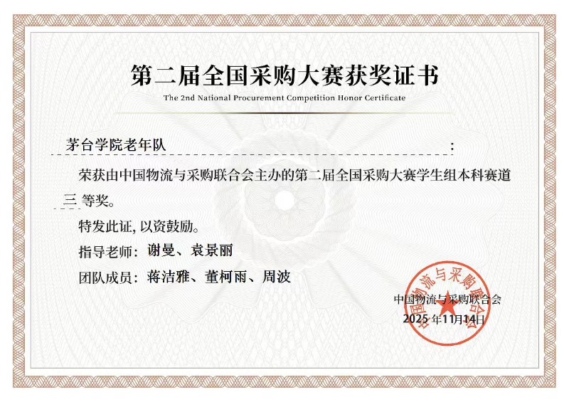 The student group finals of the 2nd National Procurement Competition recently concluded successfully. Students majoring in Logistics Management of Moutai Institute delivered outstanding performances and returned with honors. With a maximum of two teams allowed per institution, a total of 442 teams competed in the undergraduate track. After intense competition, the two teams from our institute won the first prize and third prize respectively.