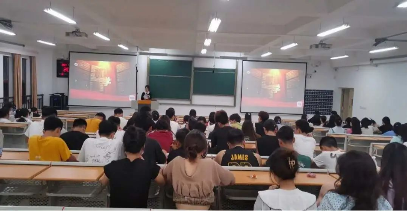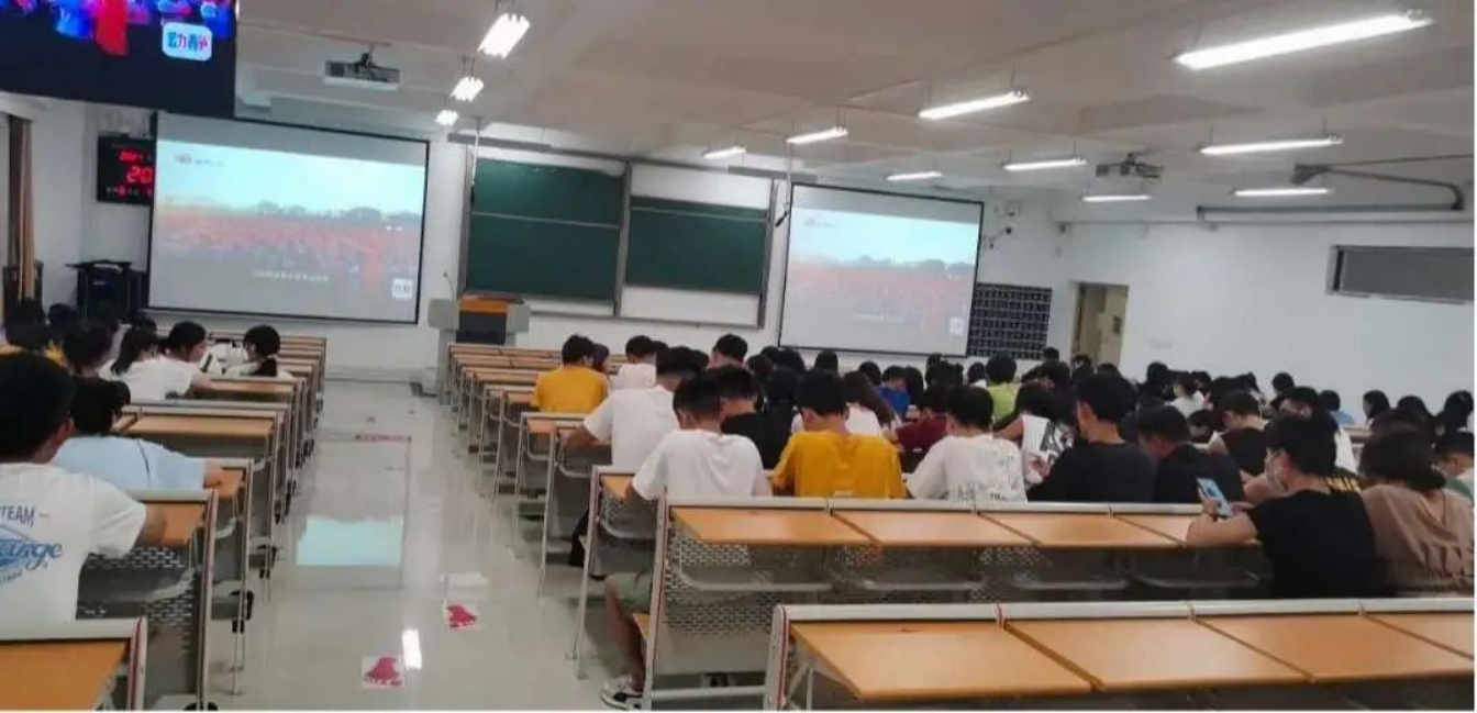 2021年8月29日20:10,旅游管理系在A1—313教室组织全系在校学生共255人观看由贵州广播电视台科教健康频道《贵州教育大讲堂》栏目策划的 “开学第一课”《请党放心 强国有我》节目。