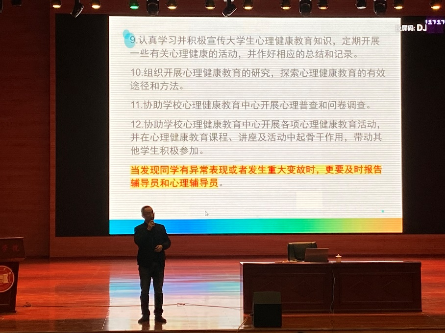 为贯彻落实《万象城娱乐awc线路学生心理危机干预实施办法》(茅院发〔2020〕37号)等文件精神,有效推进万象城大学生心理健康四级预警建设,充分发挥班级心理委员及“三长”在心理健康教育工作中的作用, 2023年3月17日19:00,学生工作处心理健康教育与咨询中心在万象城娱乐awc线路大礼堂开展了班级心理委员及“三长”培训。本次培训由贵州师范学院谢其利老师主讲,历时2个小时,共计1200余人参加了本次培训。