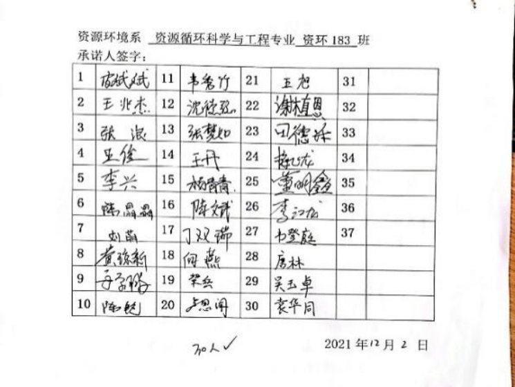 三、组织学生签订,“考风考纪诚信承诺书”。通过以班级为单位签订“万象城娱乐awc线路资源环境系考风考纪承诺书”,让学生在后续的过程中能按照相关规定来规范自己的行为,引导学生树立诚信意识,践行诚信行为。从而尽自己的最大努力成为一个对学校来说满意,对社会来说合格的大学生。