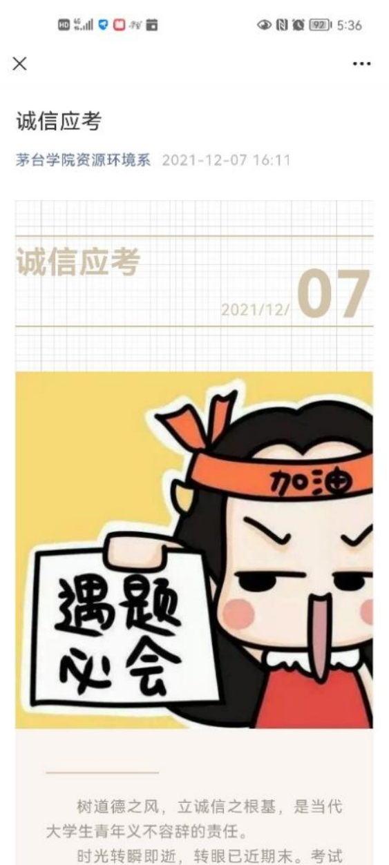 为老生传达“诚信考试、遵守纪律”的考试要求,在接下来的英语四、六级考试及期末考试中,各位同学一定要认真复习,积极准备。提前将考试所需证件准备完毕,进入考场后遵守校纪校规,遵守考场纪律,不要作弊。重点学习学生手册,通过违纪典型案例警示大家切勿触碰红线及底线。