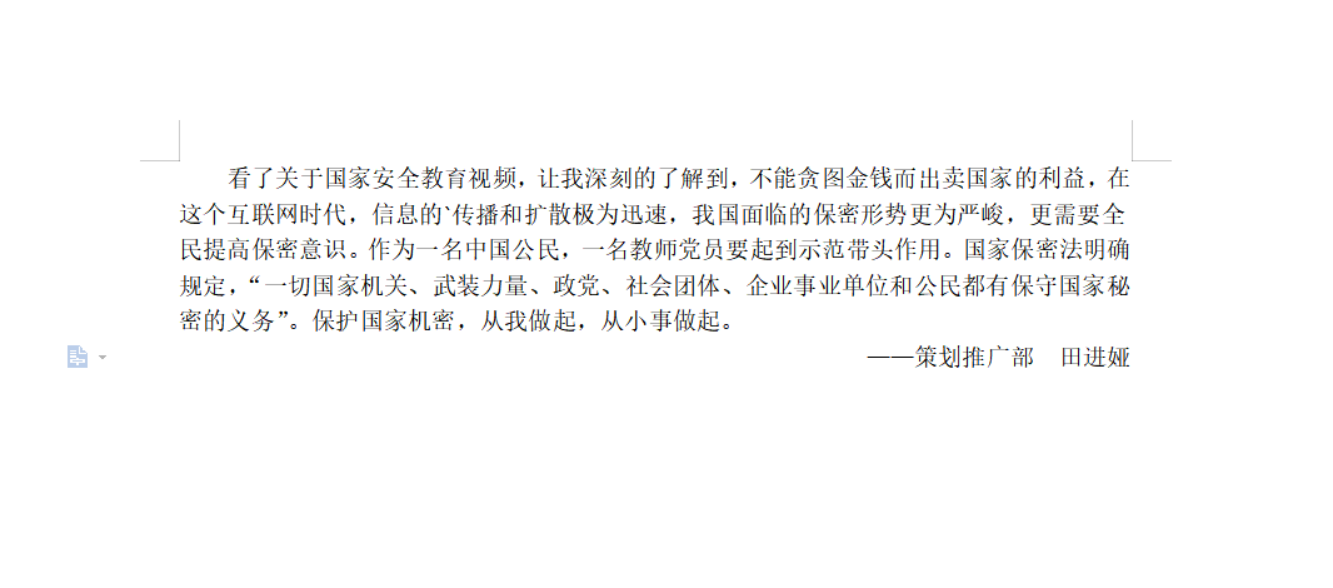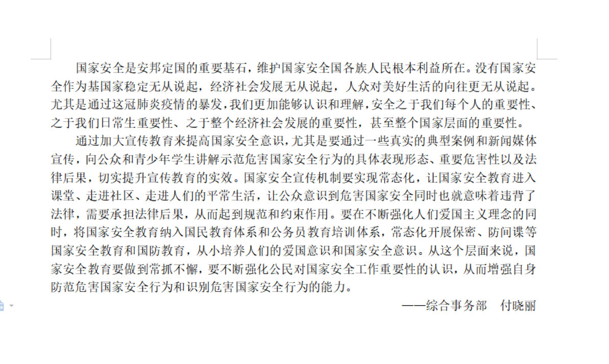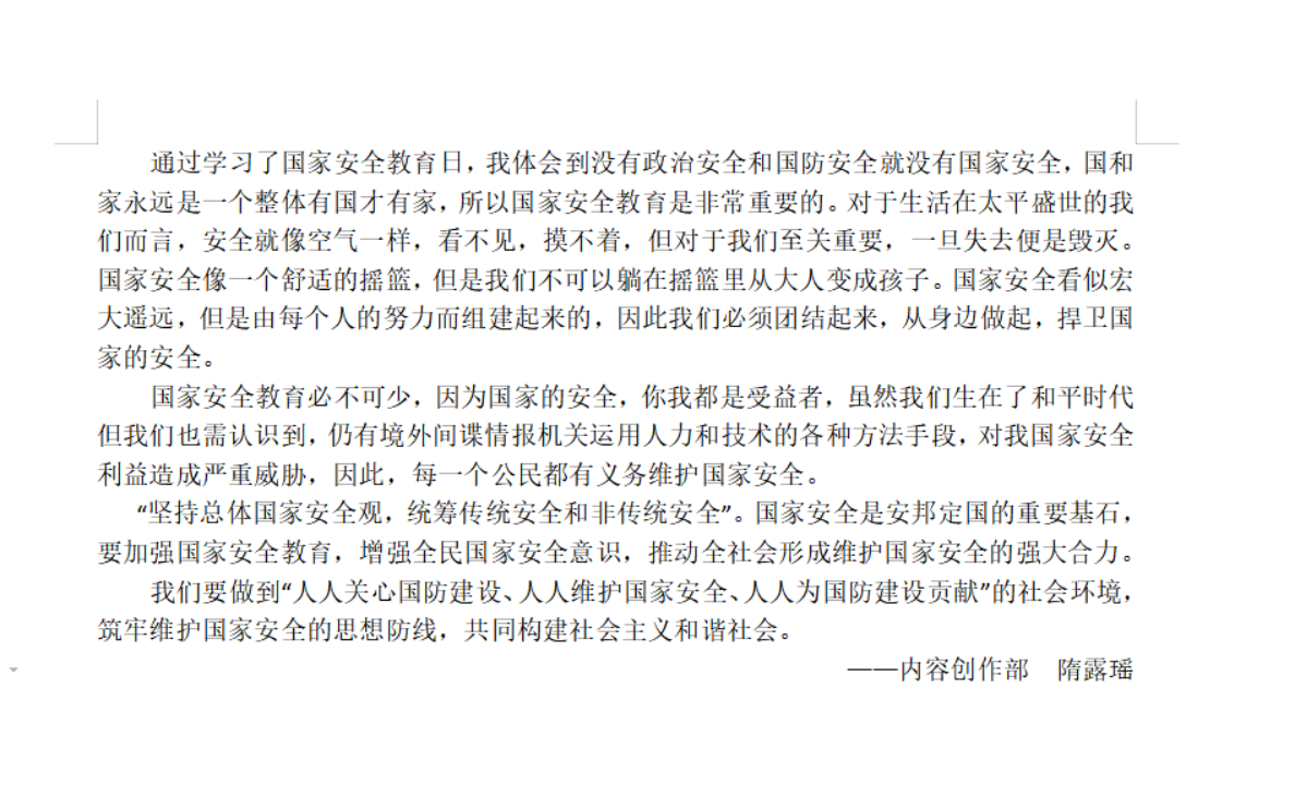 作为当代青年大学生,应时刻将国家安全置于心中,坚决不做任何威胁国家安全的事情,坚决抵制任何有可能威胁国家安全的人或事;作为学生干部,更是应该发挥带头作用,从自己做起,牢牢守住国家安全四个大字!