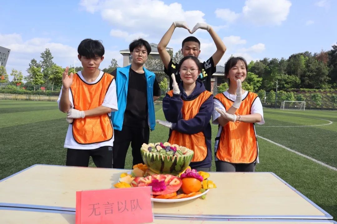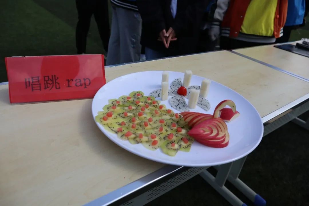 最精彩的当属水果拼盘环节,大家秉持节约理念,选择需要的水果,通过小队成员间默契配合,在想象与灵感的碰撞中,创作出一件件新异有趣的作品。其中有用水果拼装成栩栩如生的天鹅,以象征鸿鹄之志,美丽又不失深意;有用几种水果简单构造,以极简又环保的方式表达爱国、爱校之主题,当然也有用各式的水果堆叠,内含丰收之意。