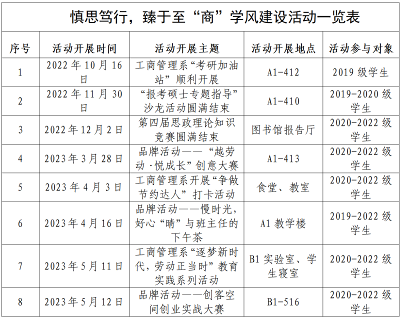 坚持以活动为载体,结合学科特点,制定系品牌方案,打造系学风活动品牌——“慎思笃行,臻于至‘商’”,挖掘品牌潜力,凝练活动特色,落实工作方案,深化学风建设效果。