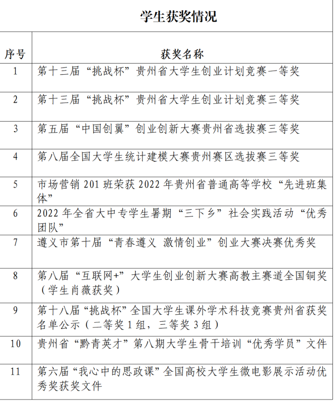 学生获“互联网+”大学生创新创业大赛高教主赛道全国铜奖1项,三下乡社会实践省级优秀团队1项,省级优秀班集体1个,“挑战杯”全国大学生课外学术科技竞赛省级二等奖1个、三等奖3个,“挑战杯”贵州省大学生创业计划竞赛一等奖1个、三等奖1个,学生参演的第六届“我心中的思政课”全国高校大学生微电影展示活动优秀奖,学生参与第八期大学生骨干培训获“优秀学员”等。