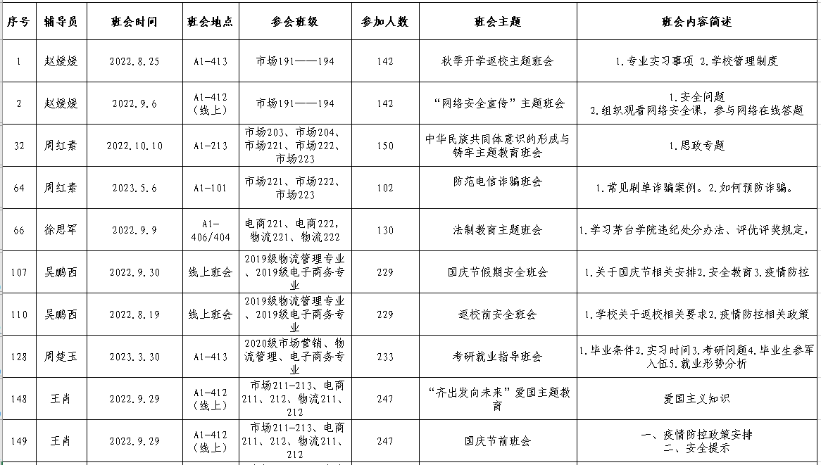 召开系“三长”工作会议,要求寝室长加强寝室内务卫生管理,层长、楼长定期严查违规电器、排查安全隐患,将细节落实到位,建立更加安全的宿舍环境。同时积极引导宿舍成员多沟通、多理解、多包容、多帮助,加强与辅导员、班主任的沟通联系,共同推进学校文明寝室建设工作的开展,营造良好的宿舍环境。增强“三长”的责任意识,发挥学生宿舍作为学生管理重要载体功能。2022-2023学年系召开全体“三长”会议两次,各辅导员召开寝室长会议12次。