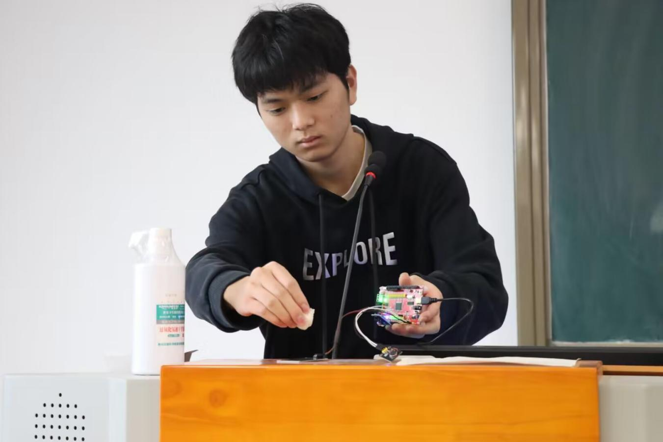 参赛的设计作品包含:秒表计时器、电子时钟、手电筒、雨滴报警器、温湿度实时监测系统等。参赛选手对作品进行了详细且专业的介绍“STC89C51单片机、SHT30温湿度传感器、发光二极管、定时器LCD显示模块、震动马达,通过在软件Keil uVision5上编写相关程序代码使两硬件所连接的引脚来相互控制作品的实际工作情况。”还有同学制作了手电筒,通过对电子器件的焊接、电路元器件的接线,让其完美运行。参赛同学的精彩展示,让评委老师和观众应接不暇。