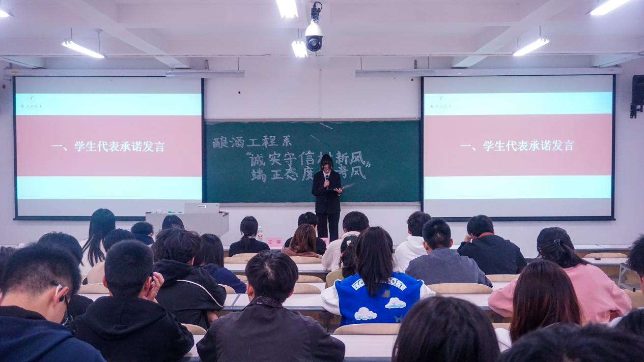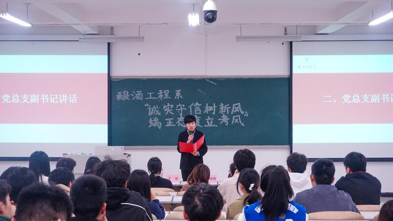 酿酒工程系党总支副书记刘晓晓老师宣读学生手册中诚信考试相关内容,告诫全体同学,考试作弊将取消学生考试资格,严重者将给予处分、开除学籍等处罚。刘晓晓老师强调,学生干部、学生党员应以身作则,发挥模范作用,自觉遵守考场纪律,以实际行动维护考场秩序。