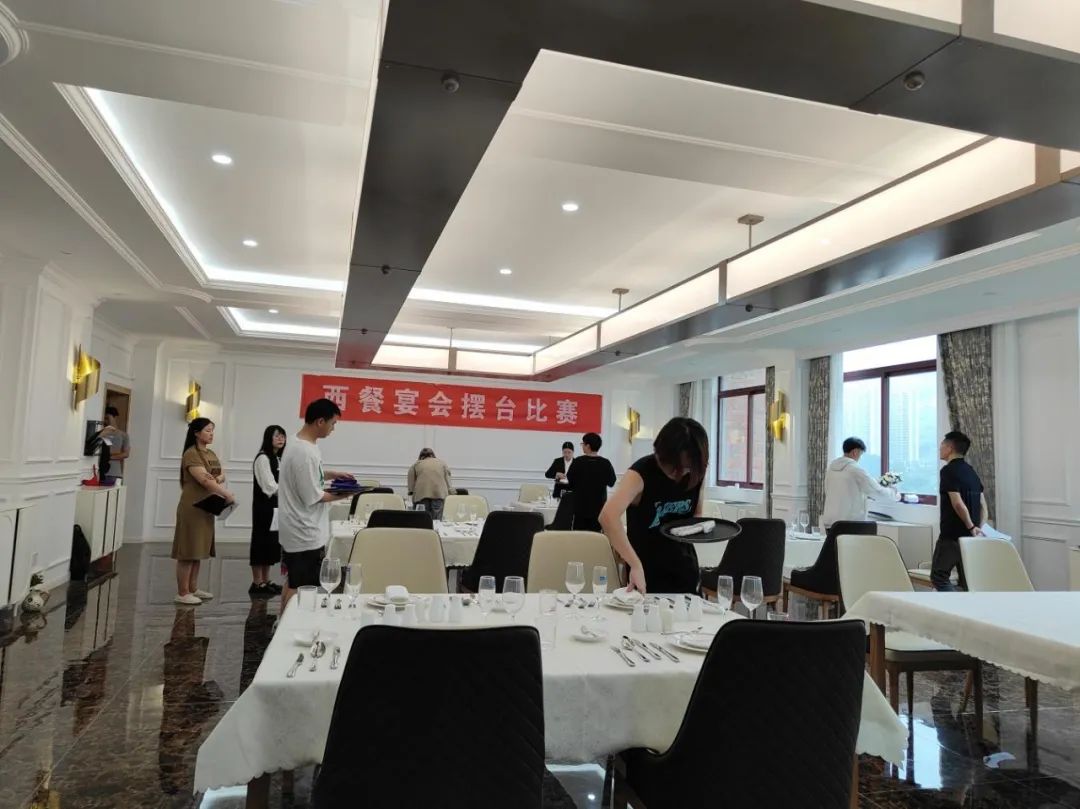 在西餐宴会摆台比赛现场,参赛选手们以优雅的姿态和熟练的动作,精确地摆放着餐具、酒杯和装饰品,每一个细节都彰显出他们对西餐宴会服务标准的精准把握。参赛同学通过精心的设计和布置,营造出了极具氛围感的宴会场景。这不仅是技能的较量,更是对美学与服务理念的融合呈现,让学生深刻体会到如何通过宴会摆台为顾客创造独特而难忘的用餐体验,对于培养具有创新思维和卓越服务意识的酒店服务人才具有重要意义。
