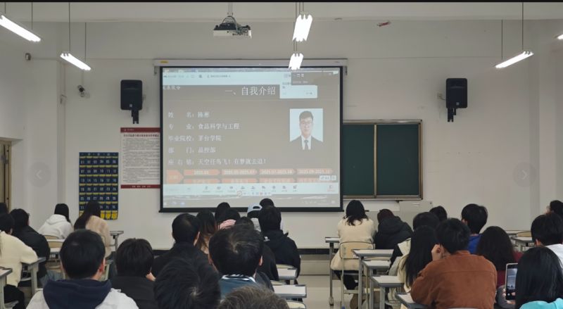本次宣讲会特别邀请学院 2021级食品科学与工程专业优秀校友陈彬现身分享。他结合自身 2025 年 3 月起在牧原品控部的实习经历,生动讲述了从学生到职业人的转变过程,分享了工作中的收获、遇到的挑战及快速成长的秘诀。作为学长,他鼓励学弟学妹们大胆投递简历、积极备战面试,真诚的分享引发了同学们的广泛共鸣。