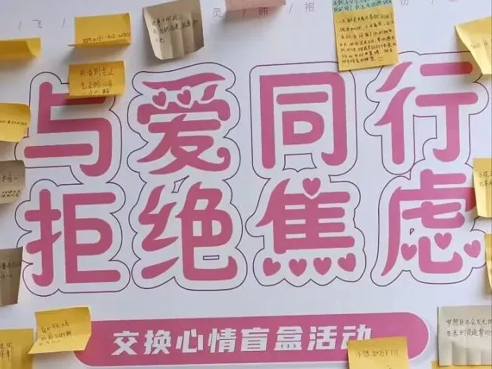 暖意予人,亦将反哺其身。流动在身边的点点善意,化成阳光点亮他人的心扉,也温暖了自己的心灵。现场,充满正能量的标签纸贴满了展板,同学们认真观看每张便签的内容,并互相交流应对焦虑的办法。
