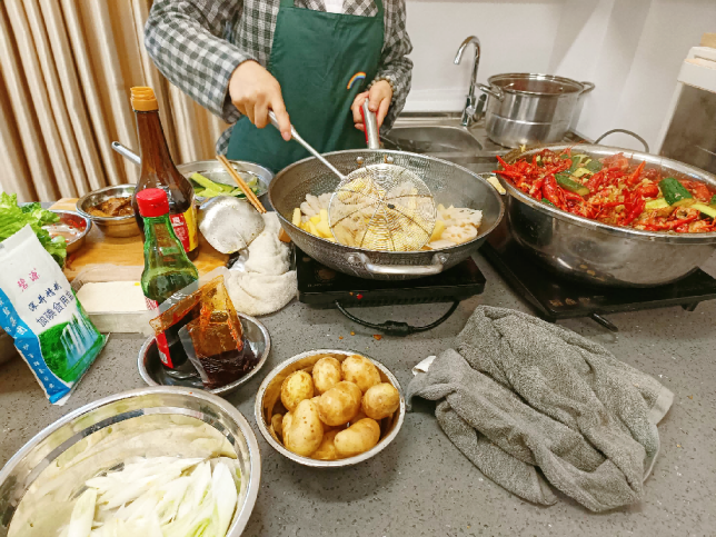 老师郭雪峰介绍,食工系一站式学生社区目前设置了1个共享厨房,在H5栋女生宿舍进行试点,自开放以来受到学生普遍欢迎,周末、节假日或毕业季是共享厨房预约最火爆的时候,麻辣香锅、炸串烙锅、家常小炒、各类火锅……这些美味可口的菜肴被做出了新花样。