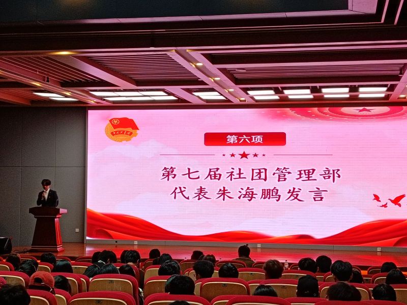 第七届社团管理部主席团代表朱海鹏发言,他表示将继承和发扬社团管理部历届的优秀传统,努力提升社团管理部的行动力与号召力,将社团管理部这个舞台留给新成员,让他们发挥自己的能力,能够更加求真务实,努力创新,将社团管理部推向另一个高峰。他期盼第七届社团管理部全体成员能够携手共进,砥砺前行,为成就社团荣誉,保护社团文化,明确社团的发展方向做出自我的奉献。