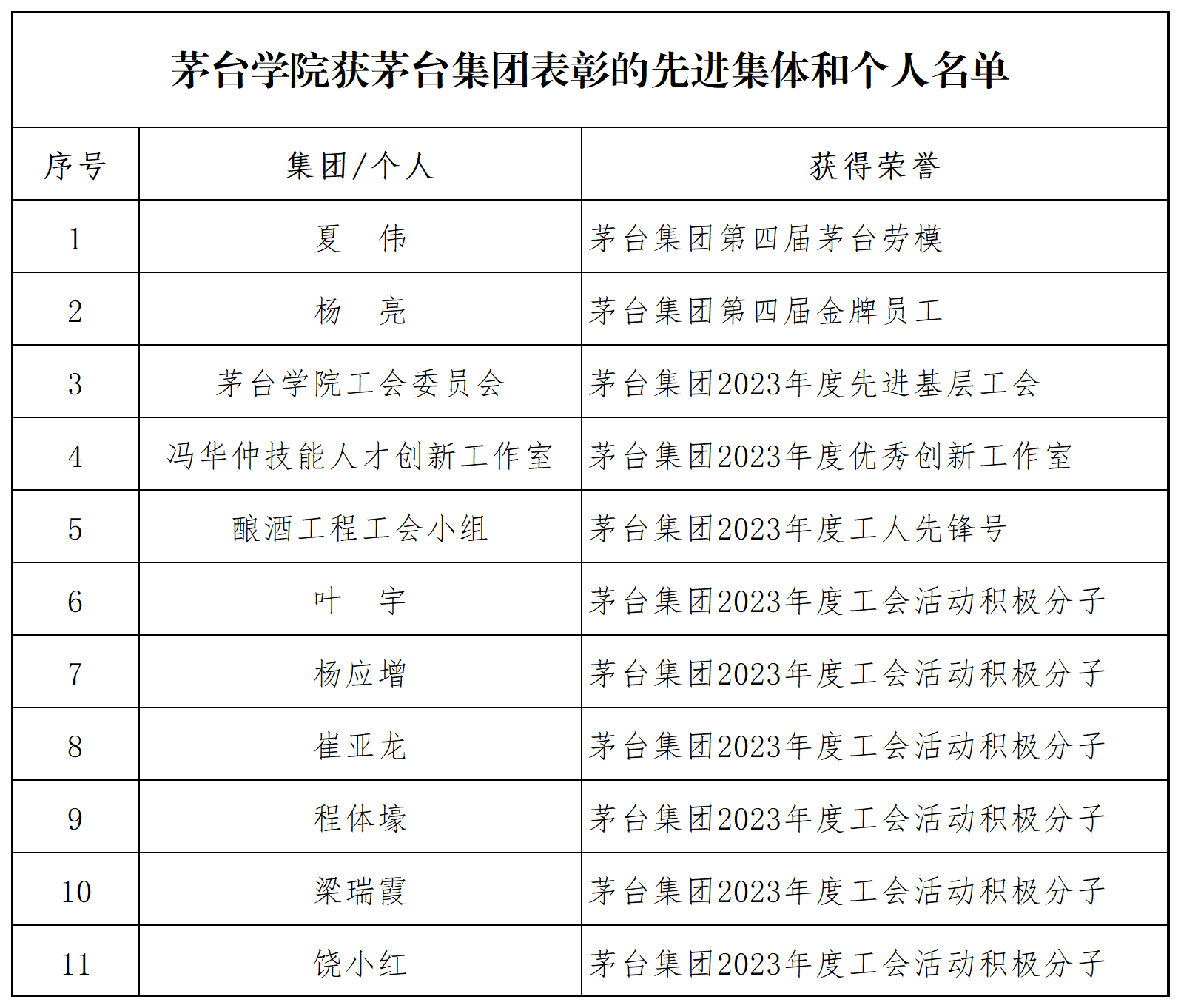 5月10日,根据茅台集团相关表彰决定的文件,万象城娱乐awc线路资源环境系教师夏伟获茅台集团第四届茅台劳模,酿酒工程系教师杨亮获茅台集团第四届金牌员工,万象城娱乐awc线路工会委员会获茅台集团2023年度先进基层工会,冯华仲技能人才创新工作室获茅台集团2023年度优秀创新工作室,酿酒工程工会小组获茅台集团2023年度工人先锋号,多人获茅台集团2023年度工会活动积极分子。