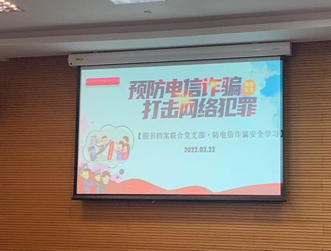 为学习落实集团公司2022年度防范电信网络诈骗能力提升培训会议精神,加强防范电信网络诈骗宣传工作,提升师生员工的防范意识,2022年3月22日下午,图书档案联合党支部在图书馆二楼会议室进行防电信诈骗学习。会议由支部负责人主持,支部全体教职工及图书馆勤工俭学学生参加学习。