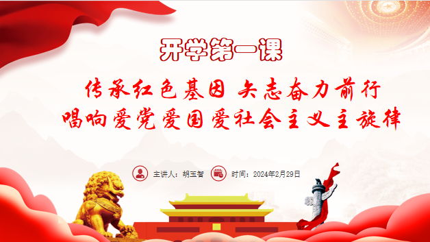 今年是中华人民共和国成立75周年,是习近平总书记“3.18”重要讲话发表5周年,同时也是《中华人民共和国爱国主义教育法》施行元年。为加强学校青年学子爱国主义教育,引导青年学子传承和弘扬爱党爱国爱社会主义主旋律,2月29日晚,公共基础教学部党支部胡玉智书记走上讲台,以《传承红色基因 矢志奋力前行,唱响爱党爱国爱社会主义主旋律》为主题,在留芳楼206教室为同学们讲授“开学第一课”。