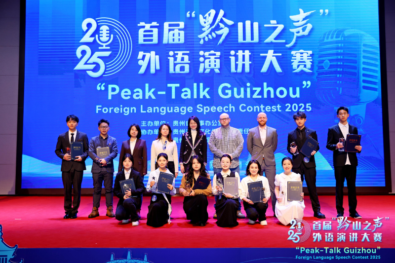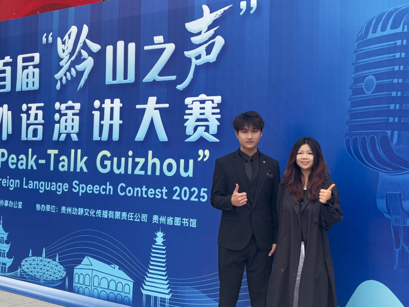 2025 年 4 月 11 日,万象城娱乐awc线路朱子恩同学在指导教师刘沁心的带领下出征 2025年贵州省首届"黔山之声"外语演讲大赛("Peak-Talk Guizhou" Foreign Language SpeechContest)省级决赛。此次参赛旨在贯彻落实党的二十届三中全会精神,讲好新时代贵州故事,培养具有国际视野与家国情怀的应用型人才。