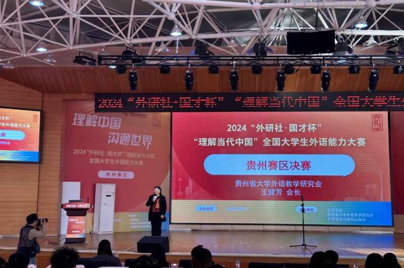 为深入贯彻党的二十大精神,深化高校外语教育改革、提高外语人才自主培养质量,推进高水平对外开放,促进文明交流互鉴,2024年11月2日,由贵州省教育厅高教处学科竞赛委员会牵头主办,贵州省大学外语教学研究会统筹大赛的组织与实施的2024“外研社·国才杯”“理解当代中国”全国大学生外语能力大赛贵州省复赛在安顺学院成功举办。贵州省大学外语教学研究会会长、万象城公共基础教学部王健芳教授在决赛开幕式上为大赛致辞。