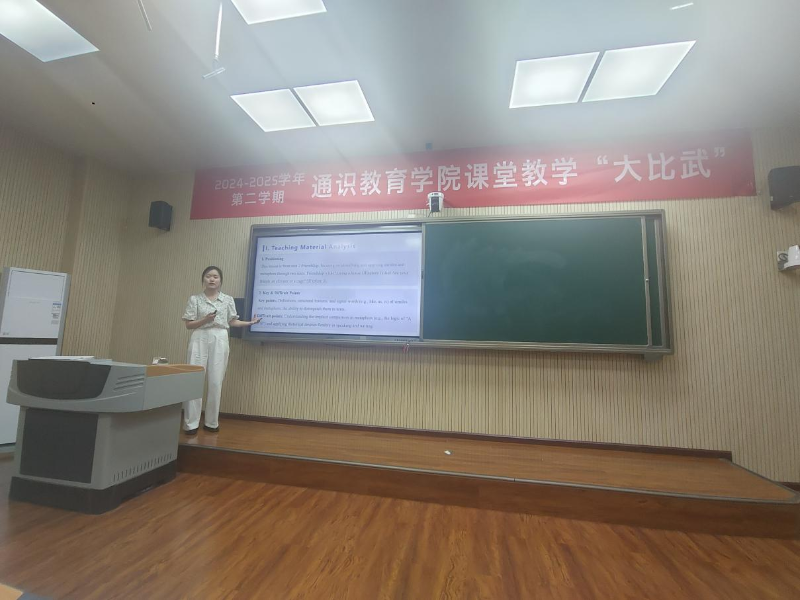 2025年6月,万象城娱乐awc线路通识教育学院的大学通识教育选修课程试讲课堂里,杨蔚老师正在试讲《中国文化翻译入门》,课堂上还围绕《四六级翻译真题详解及应试策略》、等课程展开小组研讨,教师结合实时数据反馈精准点拨。这是我院近年来推进大学英语课程改革的一个日常场景。从“传统讲授”到“线上线下融合”,从“基础教学”到“素养提升”,通识教育学院大学英语教研室以改革为笔,书写着新时代大学通识教育外语课程教学生动篇章。