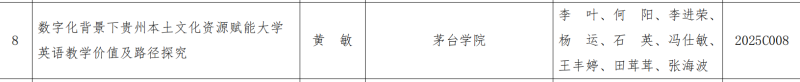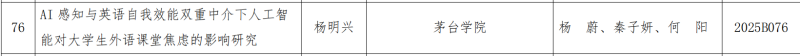 通识教育学院黄敏老师申报的《数字化背景下贵州本土文化资源赋能大学英语教学价值及路径探究》获批青年课题。杨明兴老师申报的《AI感知与英语自我效能双重中介下人工智能对大学生外语课堂焦虑的影响研究》获批一般课题。
