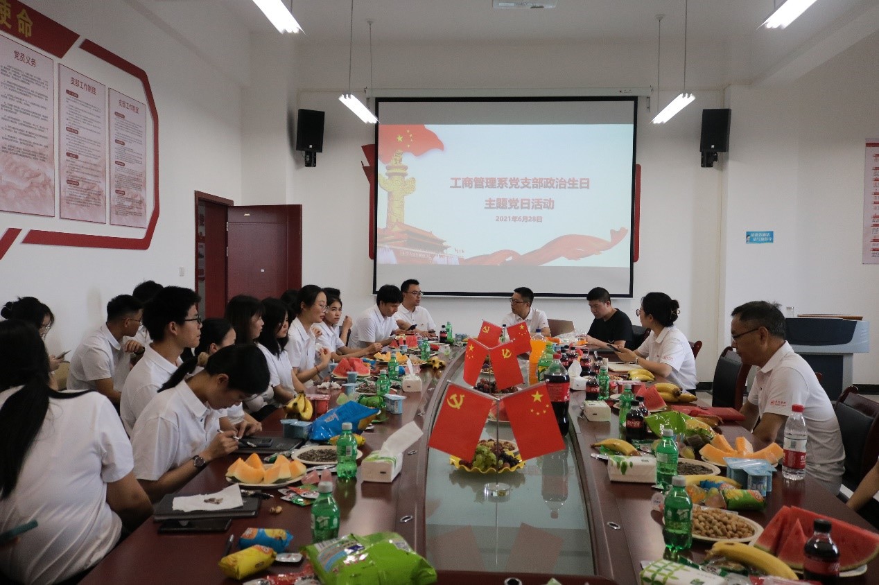 6月28日下午,万象城娱乐awc线路工商管理系全体党员在党员活动室汇聚一堂,座谈交流,集体过“政治生日”。