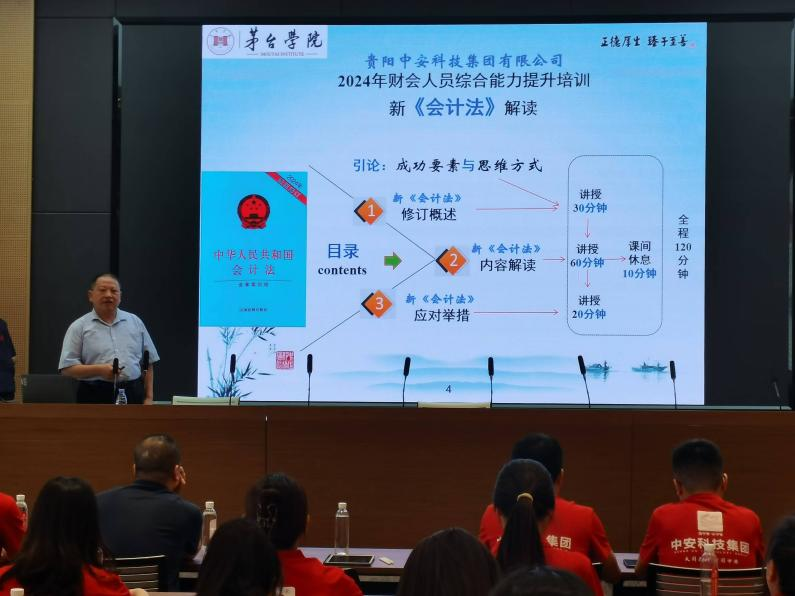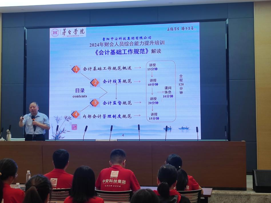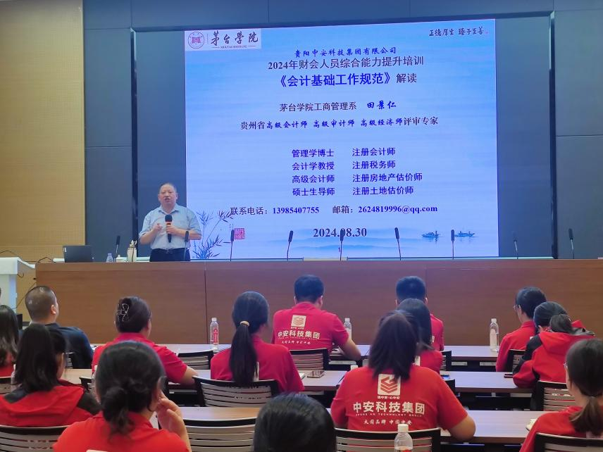为提高公司财会人员综合能力,增强财会人员风险意识,夯实会计工作基础,2024年8月30日,田景仁教授应邀为贵阳中安科技集团公司30多名财会人员举办新修改的《中华人民共和国会计法》和《会计基础工作规范》两场专题讲座。