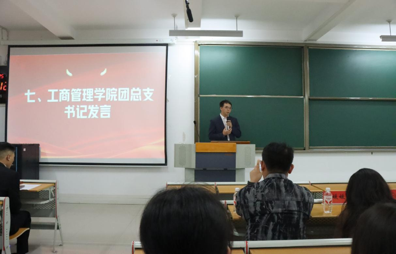 工商管理学院团总支书记邱旭老师发言。他首先感谢党总支和同学们的信任,表示将以饱满的热情履行职责。同时,他向上一届团学团队的辛勤付出致以衷心感谢。随后,他对新一届学生干部提出工作要求,要强化思想引领,提升服务效能,锤炼自身本领,鼓励大家以责任为起点,在服务同学与自我成长中书写新篇章。