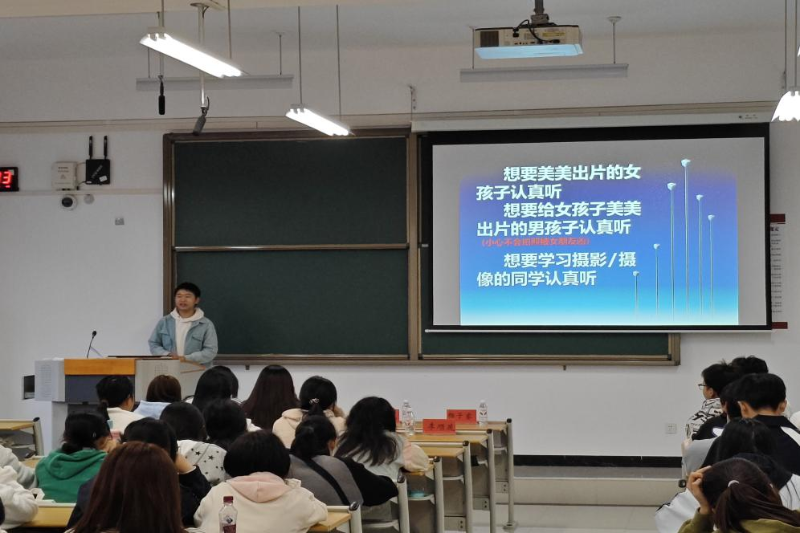 学生会宣传部副部长杨子睿通过现场演示,分享新闻照片构图、视频拍摄角度及后期基础剪辑方法,提升学员视觉宣传技能。