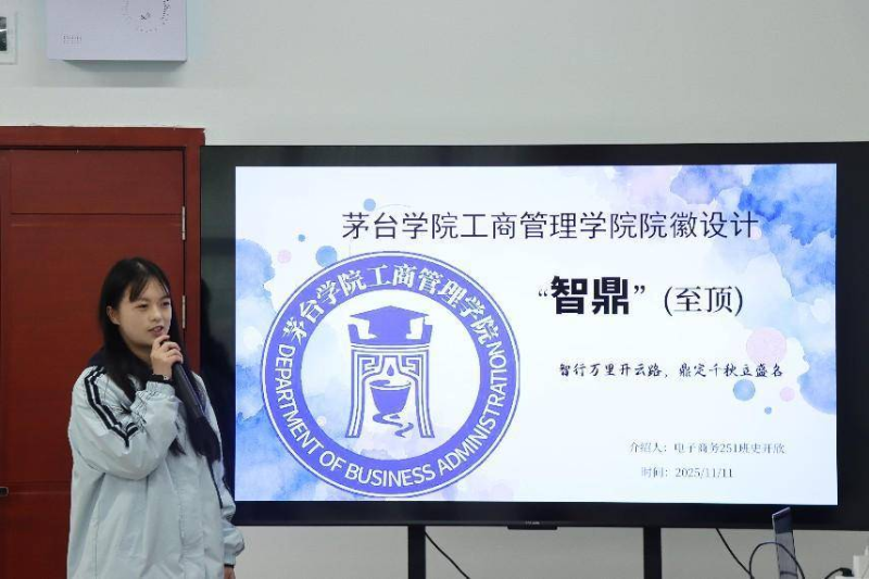 复赛以作品展示+设计者阐述+评委点评的形式开展,参赛选手围绕设计理念、元素寓意、色彩搭配等进行深入讲解。作品紧扣学院定位,巧妙融合工商管理的学科内涵与茅台文化的深厚底蕴,展现创作者的巧思构想。